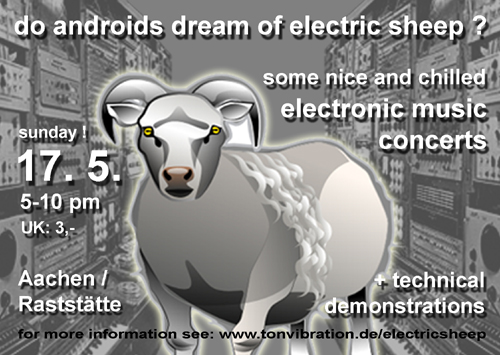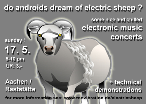 | Do androids dream of electric sheep? Sonntag 17. Mai 2009 17-22uhr. Mehrere Konzerte elektronischer Musik bilden den Rahmen für diese Veranstaltung im Kulturverein Raststätte in Aachen (Lothringer Strasse). Passend zum sonntäglichen Spätnachmittag werden die meisten im Bereich Chillout und Ambient angesiedelt sein (man weiss aber nie, was aus den Maschinen sonst noch rauskriecht.....). Dazwischen gibt es ein paar kurze Erläuterungen was da überhaupt live gemacht wird, wie so ein elektronisches Liveset entsteht und einige Geräte werden vorgestellt. |